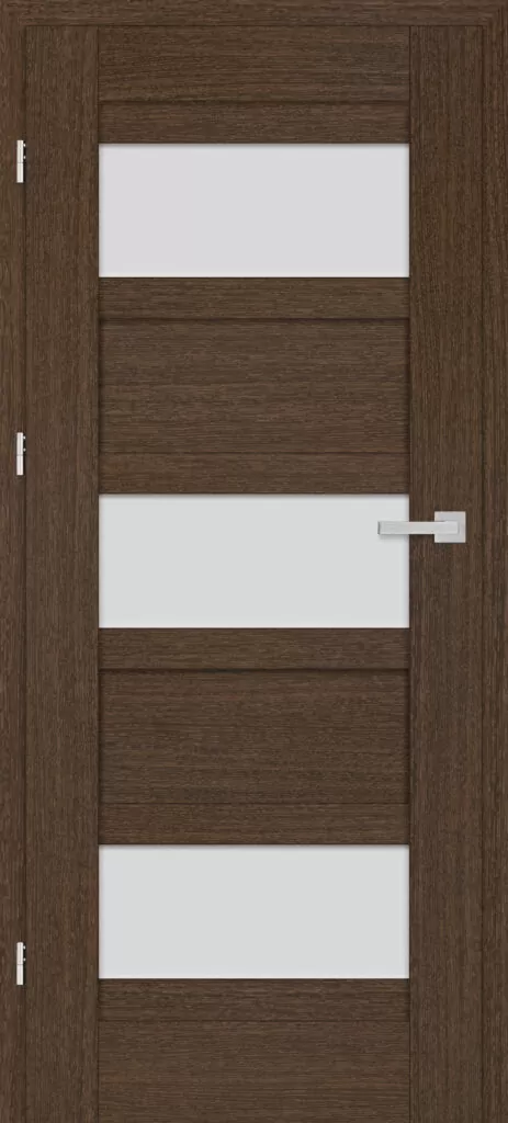 Drzwi wyposażono w solidne okucia: trzy srebrne zawiasy dwuczęściowe z regulacją poziomą w wersji przylgowej oraz dwa (z opcją trzeciego) ukryte zawiasy malowane na srebrno, a na życzenie także w kolorach czarnym, złotym lub białym. Zawiasy są dostarczane i wyceniane wraz z ościeżnicą, co gwarantuje pełną kompatybilność.