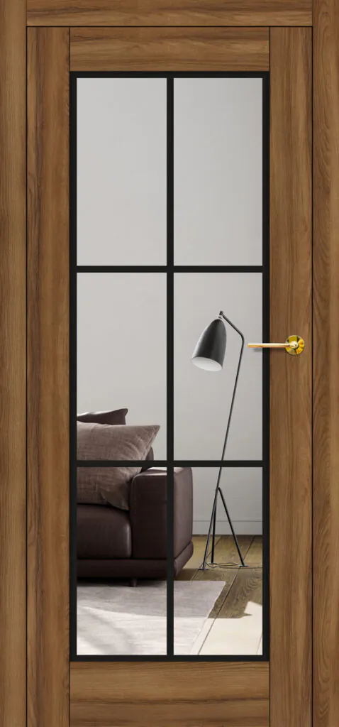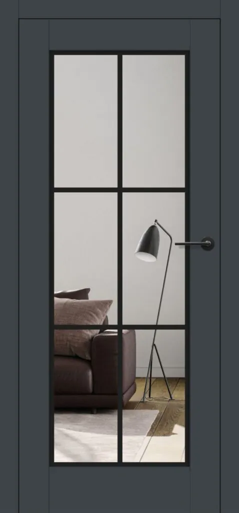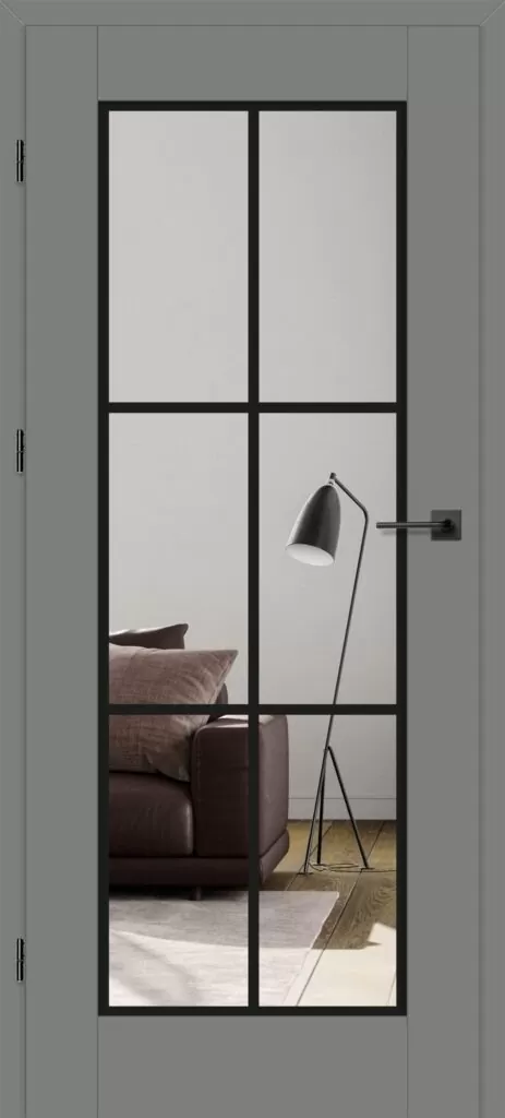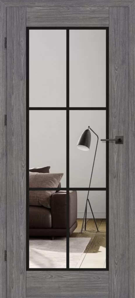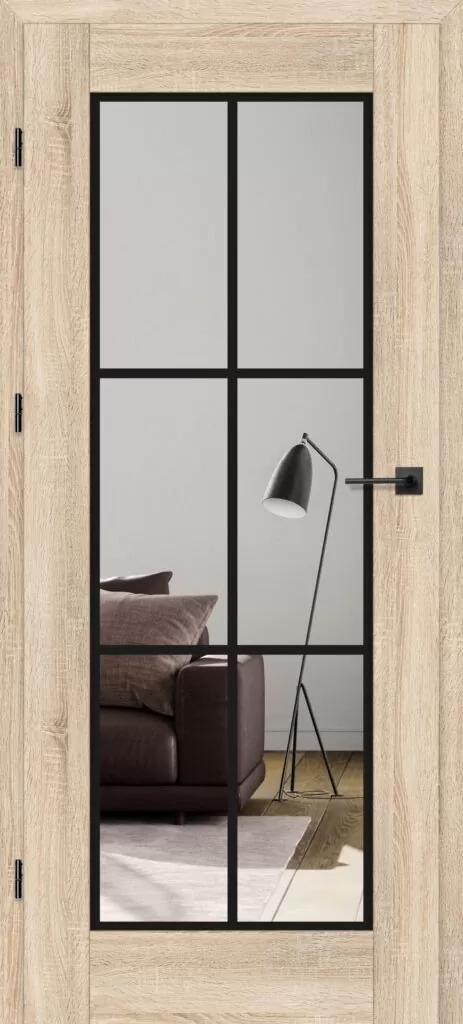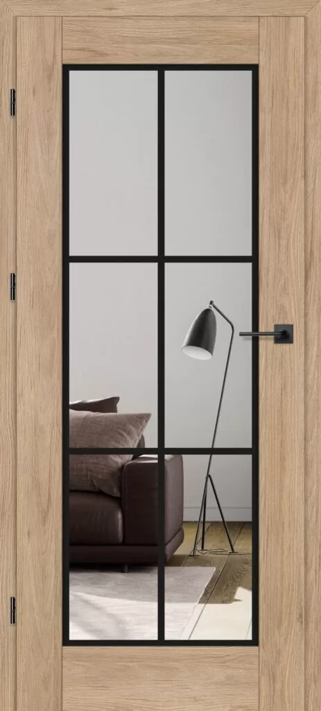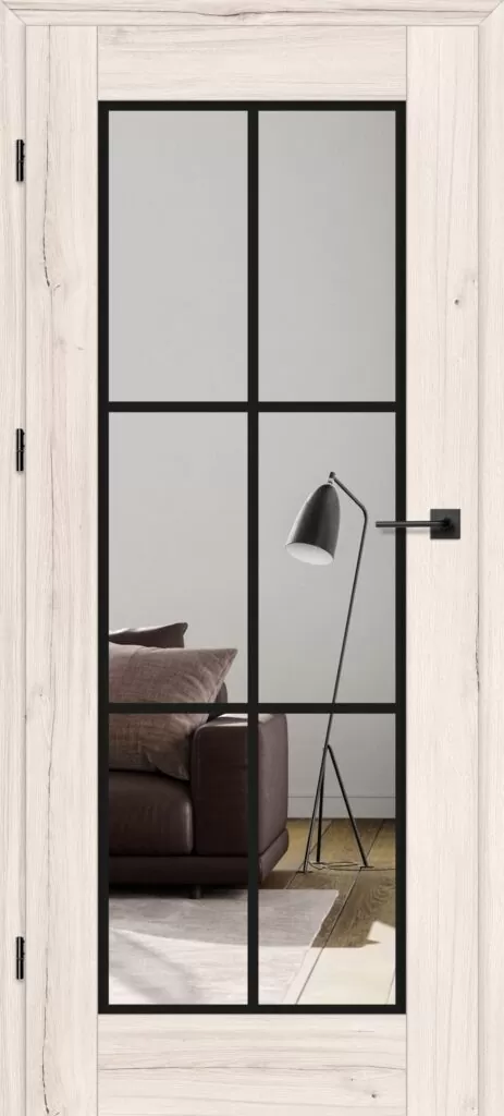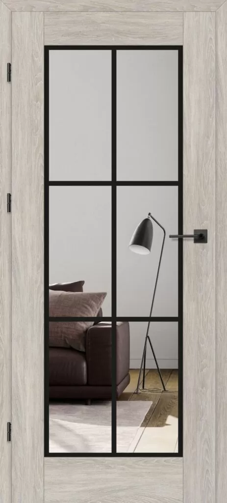 Drzwi Erkado Miskant 1 to model z dużą, przeźroczystą szybą podzieloną loftowym, czarnym szprosem na sześć pól. Taka konstrukcja łączy praktyczność z wyrazistymi walorami dekoracyjnymi, rozświetlając i optycznie powiększając wnętrze. Miskant 1 doskonale wpisuje się w styl industrialny, dodając pomieszczeniom nowoczesnego, loftowego charakteru.