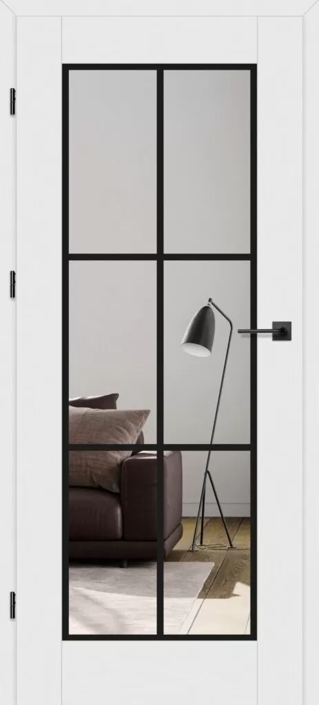 Przeszklenie wykonano ze szkła hartowanego o grubości 4 mm, w wersji przezroczystej. Za dopłatą dostępna jest bezbarwna szyba klejona VSG z wewnętrzną aplikacją, gwarantującą większe bezpieczeństwo. Czarna grafika szprosów o grubości 18 mm wykonana jest techniką sitodruku na jednej stronie szyb, co ułatwia czyszczenie i zachowanie estetyki drzwi.