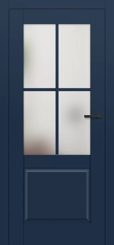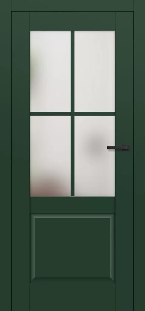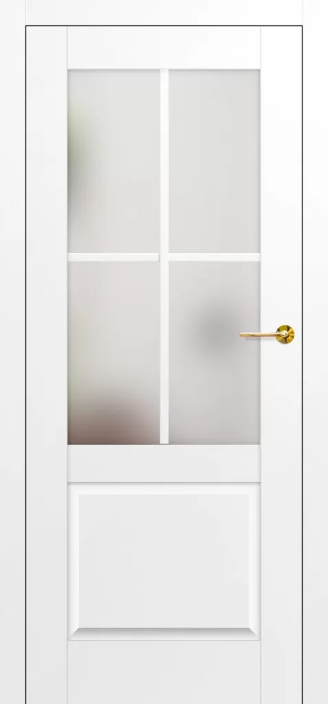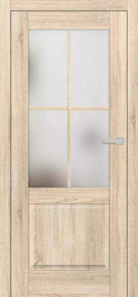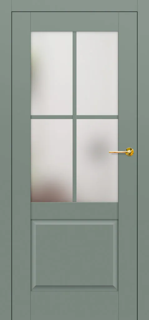 Skrzydło drzwi wyróżnia klasyczna, ozdobna płycina lub para płycin w dolnej części, a w górnej – przeszklona część z szerokim, 25-milimetrowym szprossem naklejanym na szybę. Szpros dzieli szybę na 4 lub 6 równych pól, co nadaje drzwiom wyjątkowy, stylizowany charakter. Dwustronny szpros o szerokości 25 mm oraz odpowiedniej wysokości pionowej (12 mm) i poziomej (8 mm) idealnie odwzorowuje klasyczne rozwiązania stolarskie.